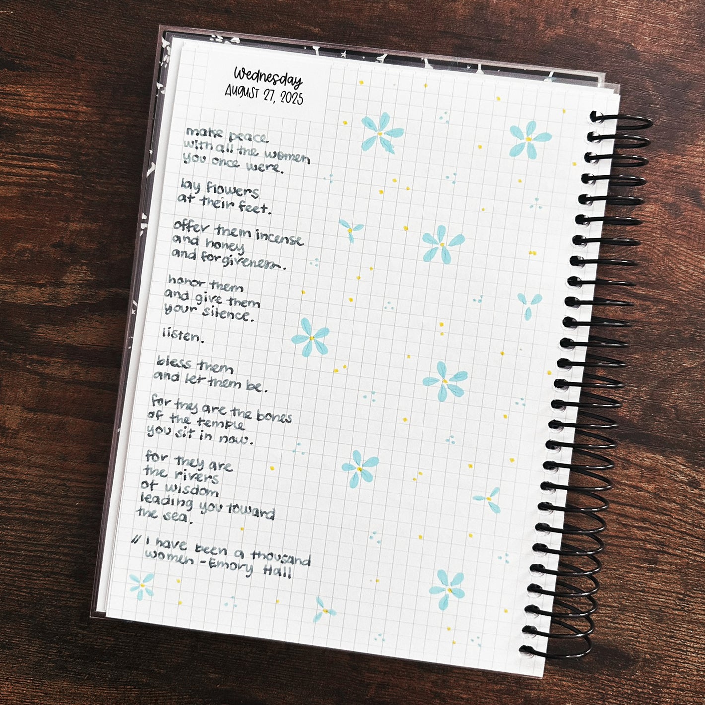 When I wanted a planner that could hold both structure and scribbles, I made Daisy: a half-year coiled journal with dated monthly + daily pages on a simple graph background.