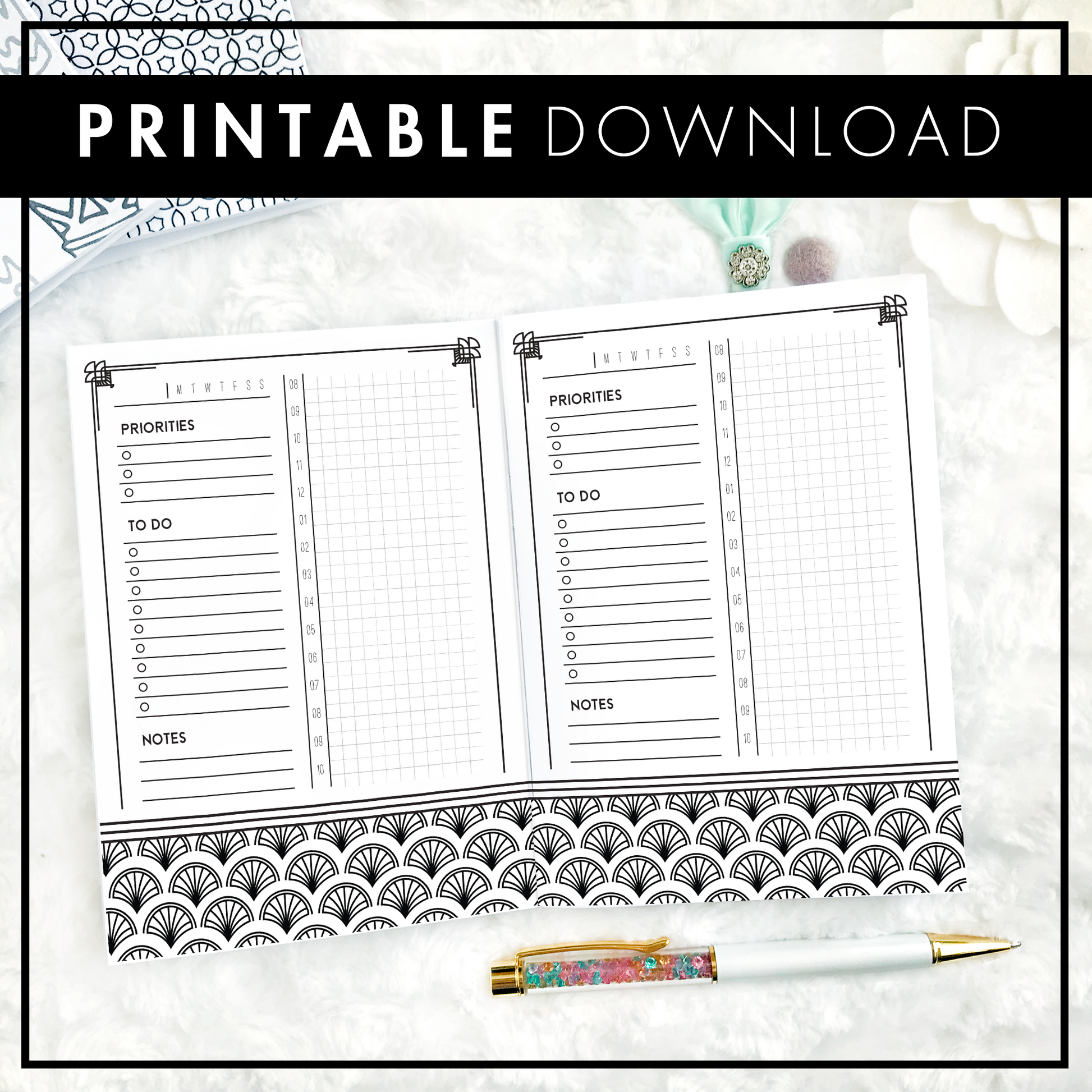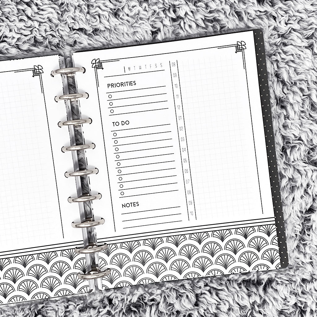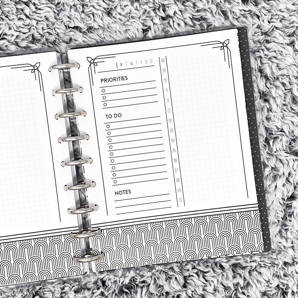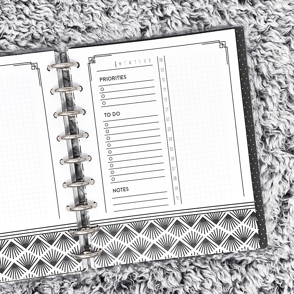 Description: The Art Deco Daily pairs unique art deco design with powerful structure to help you track your to dos, priorities, and hourly schedule.