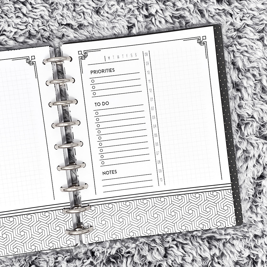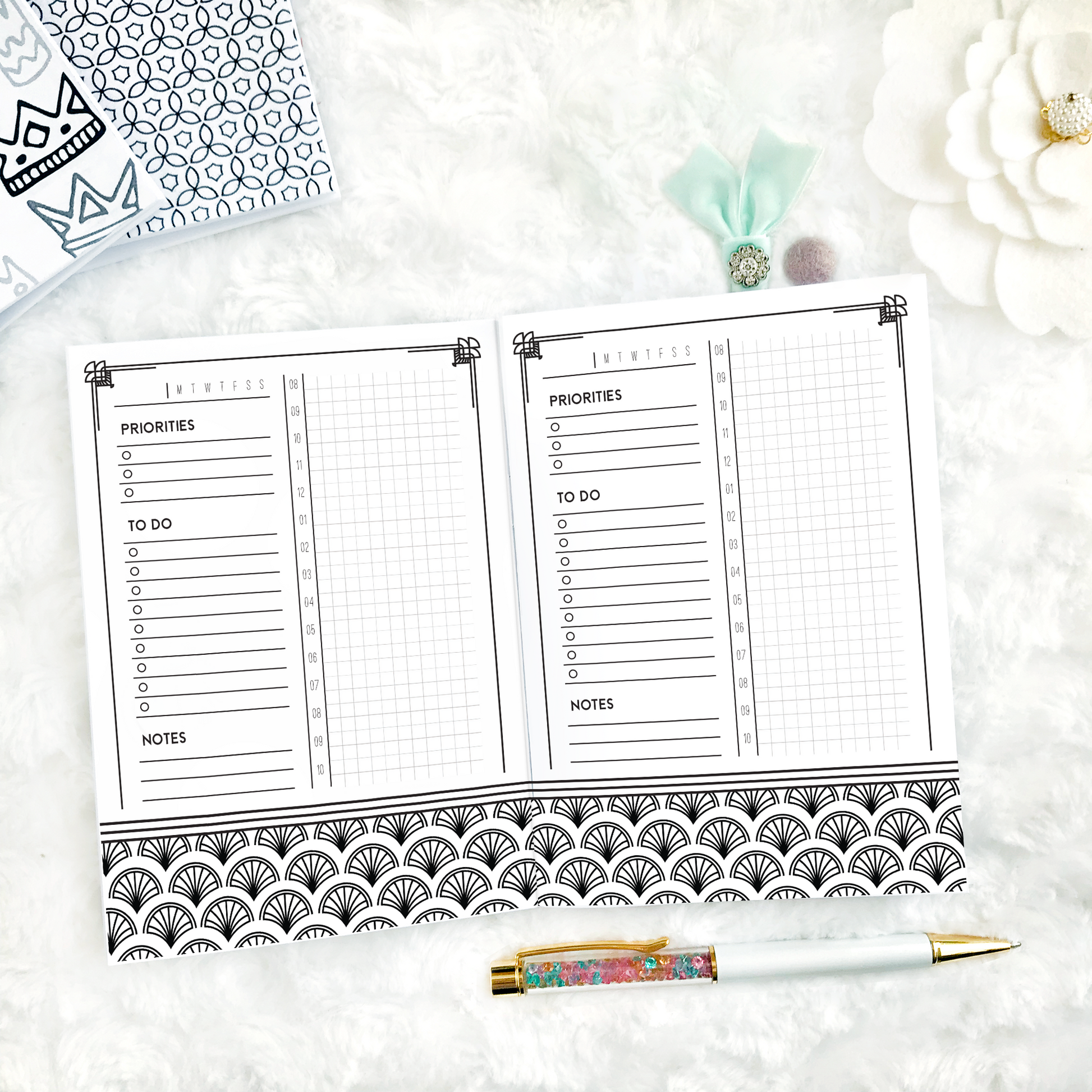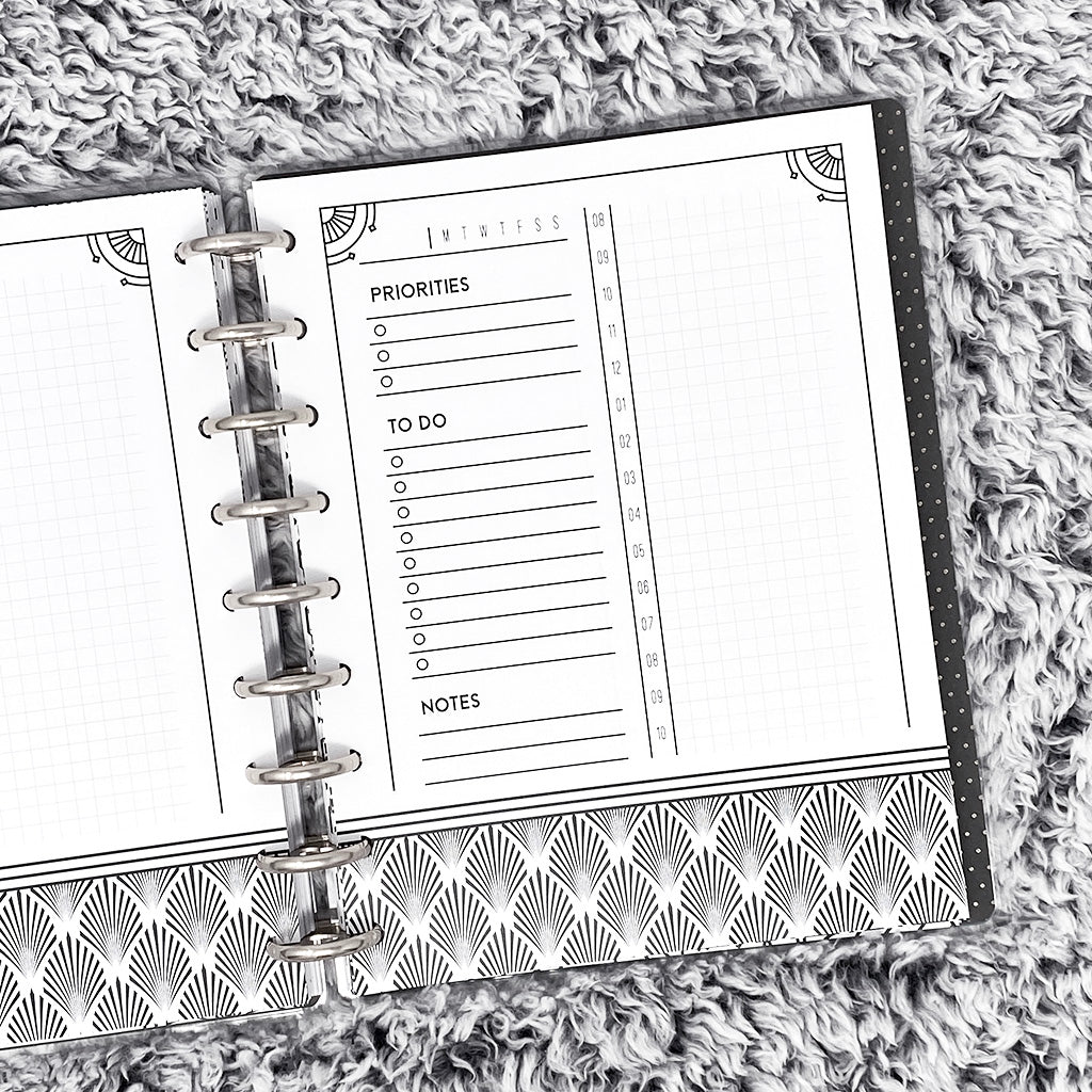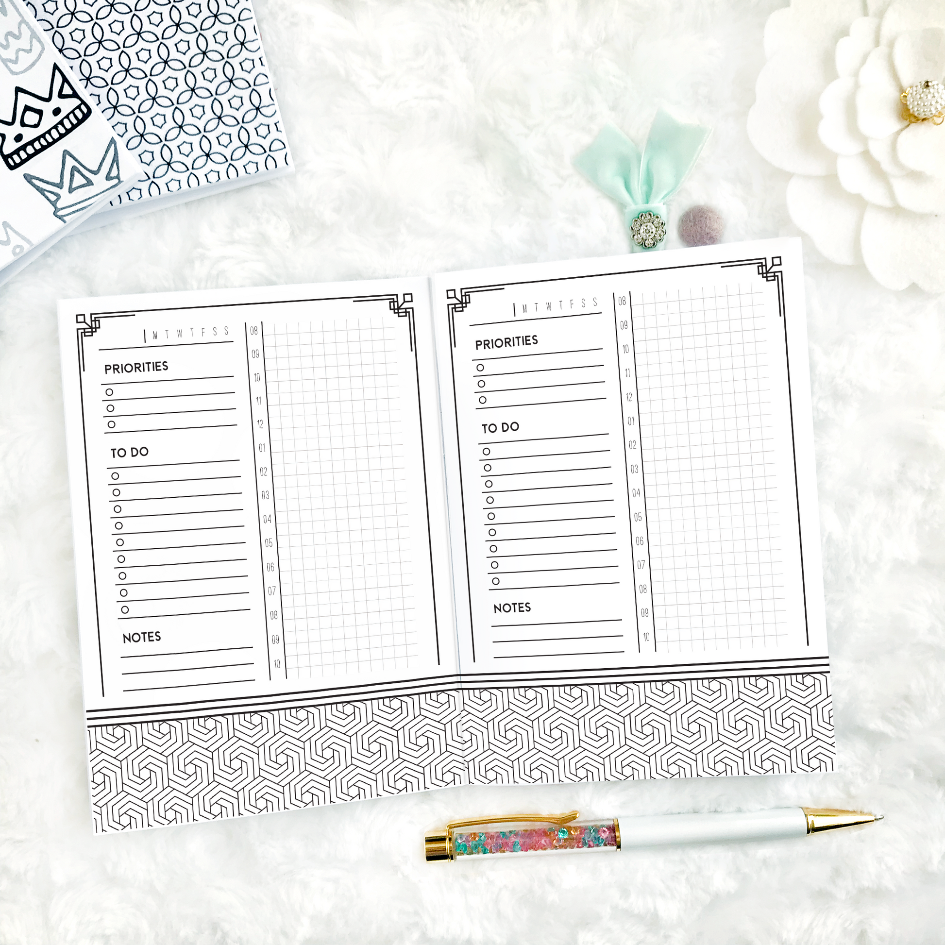 Description: The Art Deco Daily pairs unique art deco design with powerful structure to help you track your to dos, priorities, and hourly schedule.