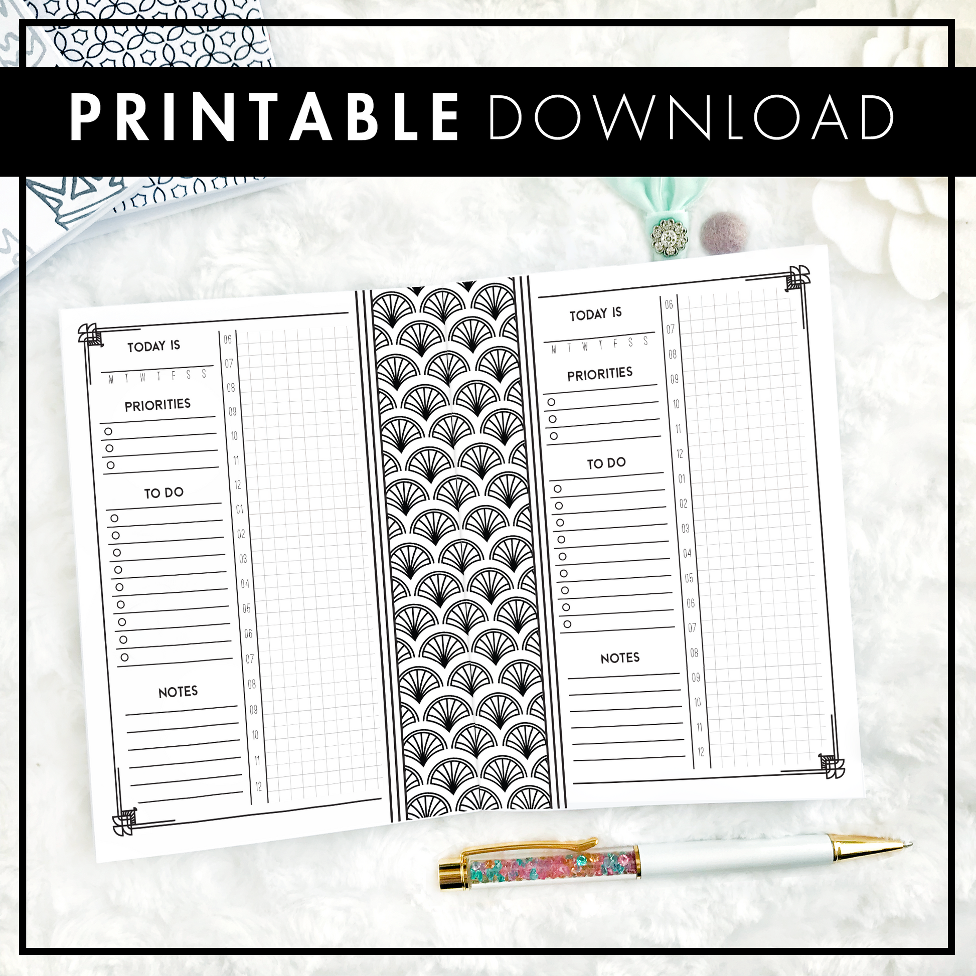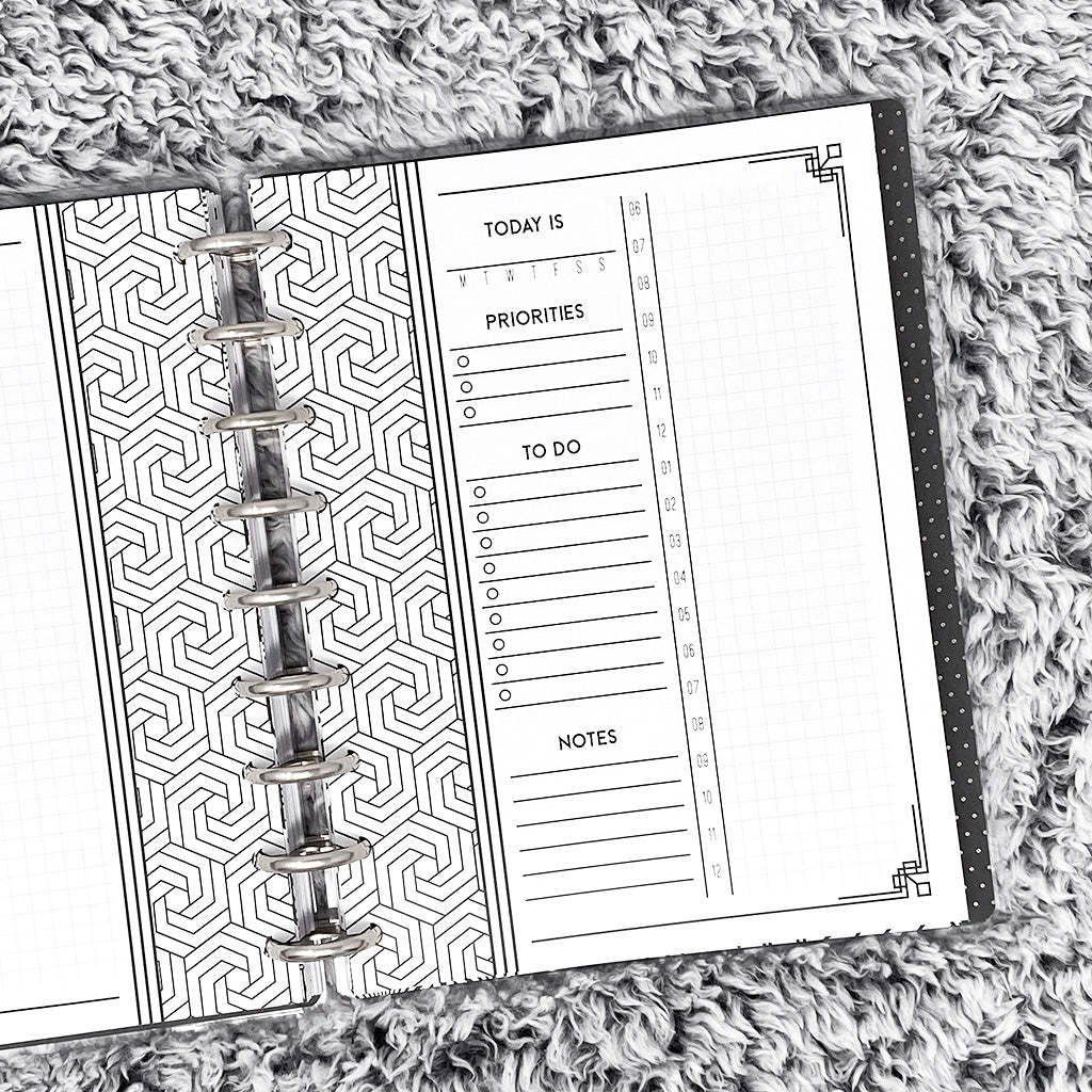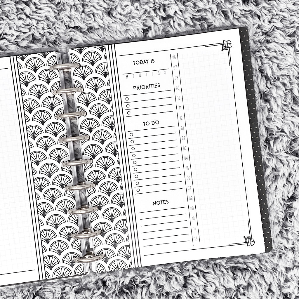 Description: The Art Deco Daily pairs unique art deco design with powerful structure to help you track your to dos, priorities, and hourly schedule.