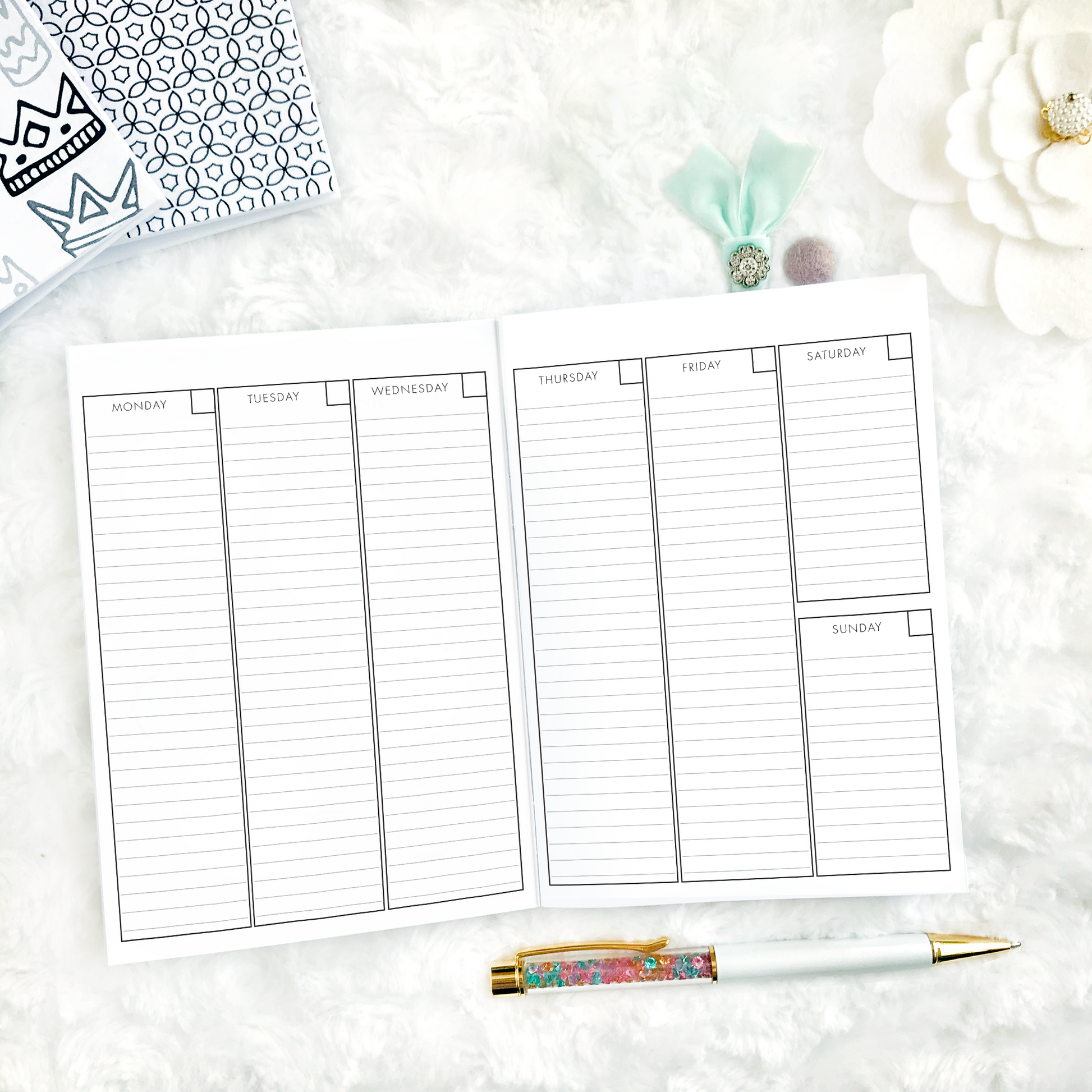 - Two-page, undated weekly layout