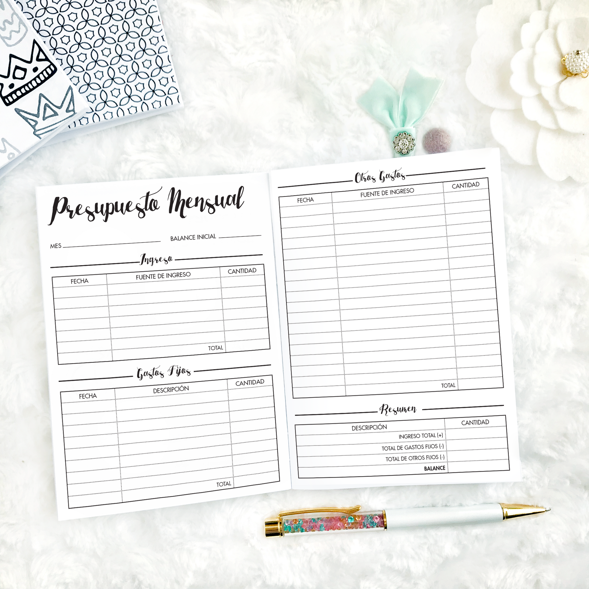 - 12 months of monthly budgeting pages (24 pages)