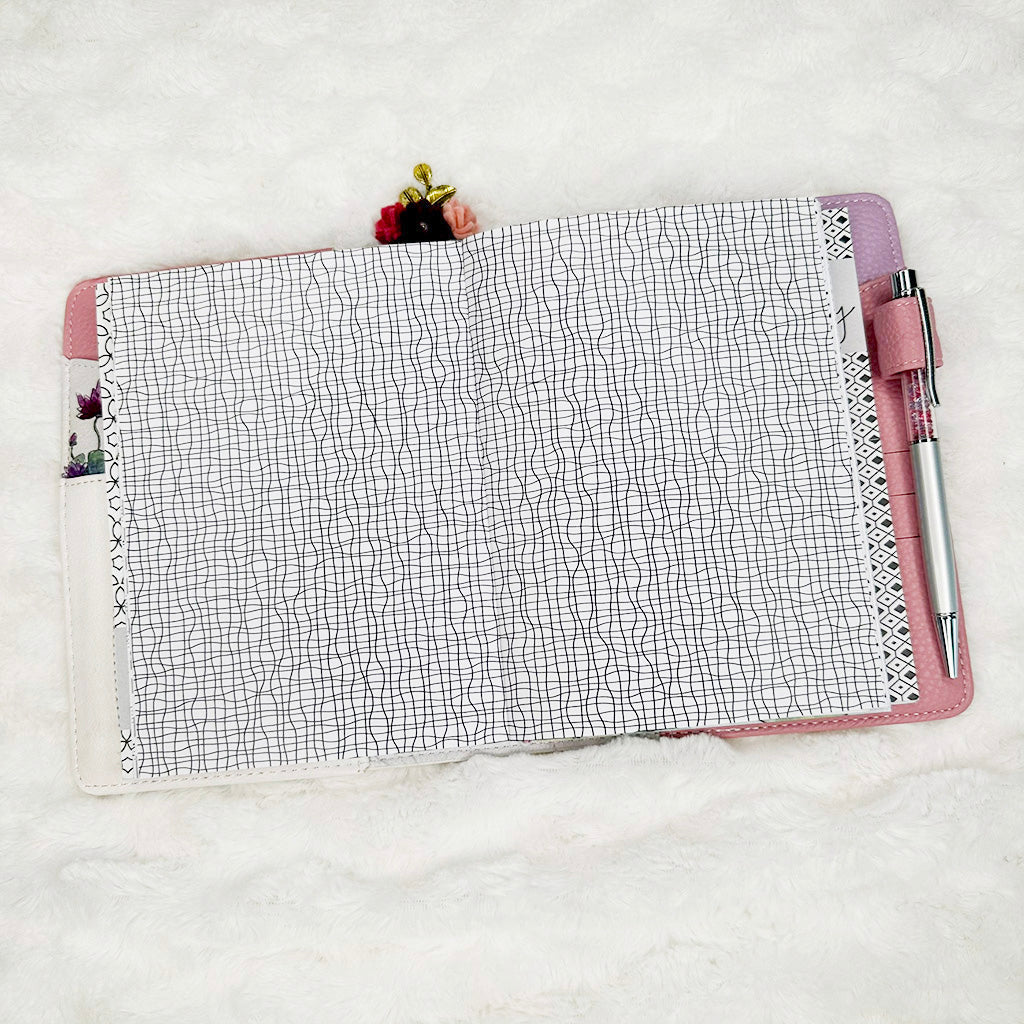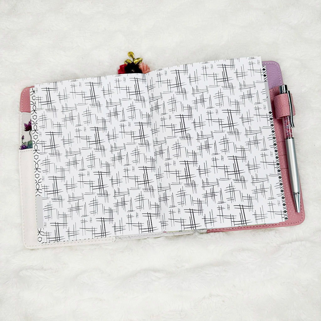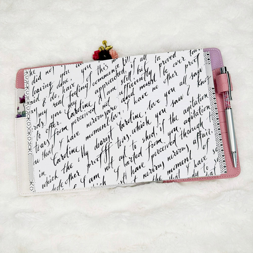 All inserts are cut, punched and bound by hand with love. This means binding and holes may not align exactly from one insert to the next. You will not notice such small variance once inserts are placed your planner.