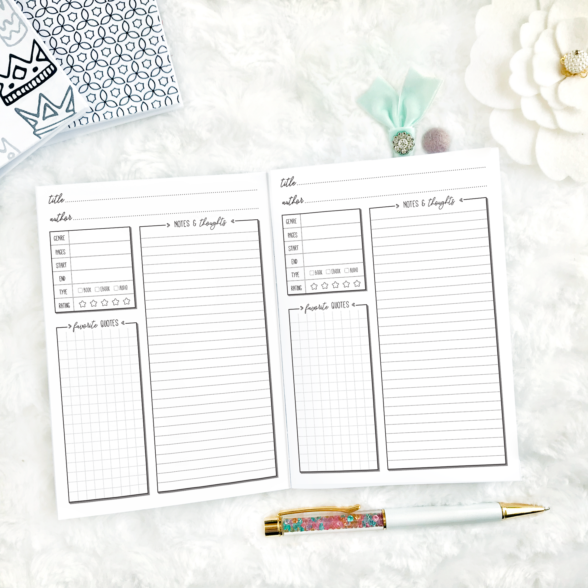- genre, page count, start and end dates, book type, and rating, while also jotting down your favorite quotes and thoughts.