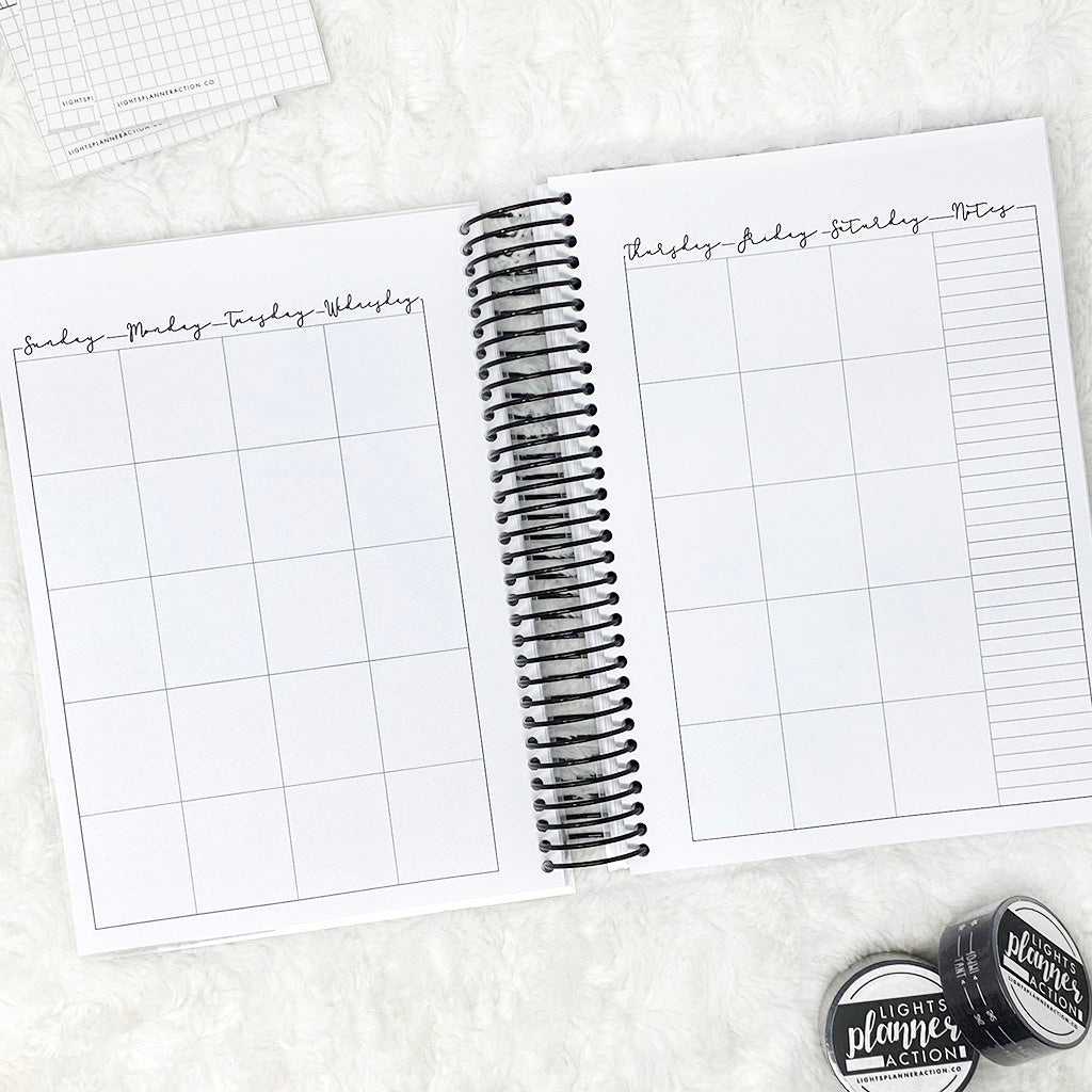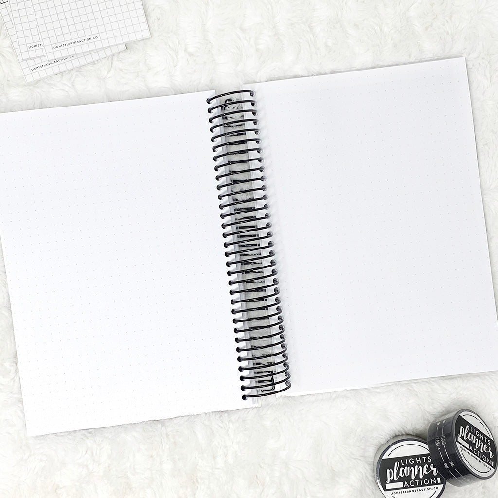 - Each month is laid out as follows: Monthly Spread, Weekly Spread x5, Dot Grid, repeat.