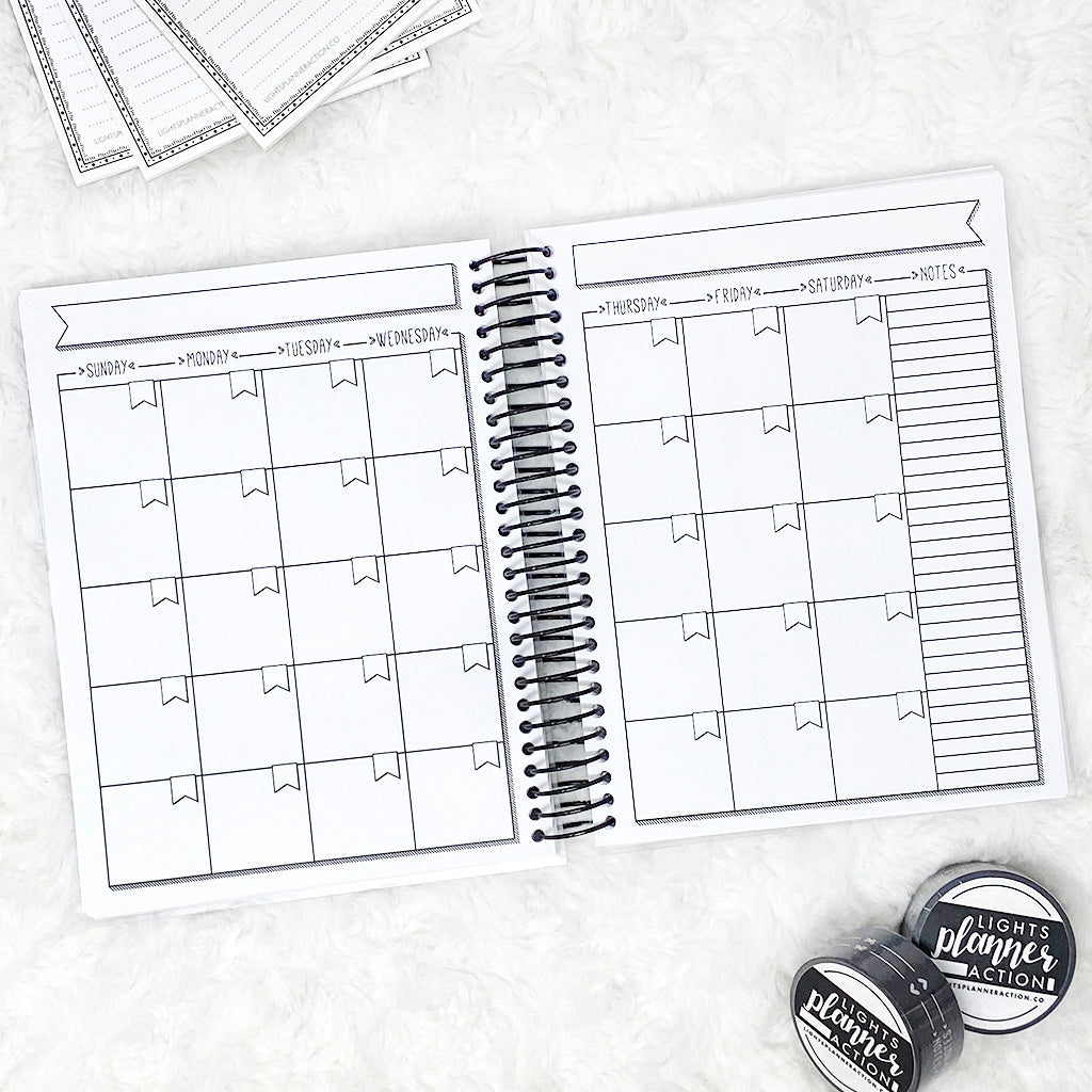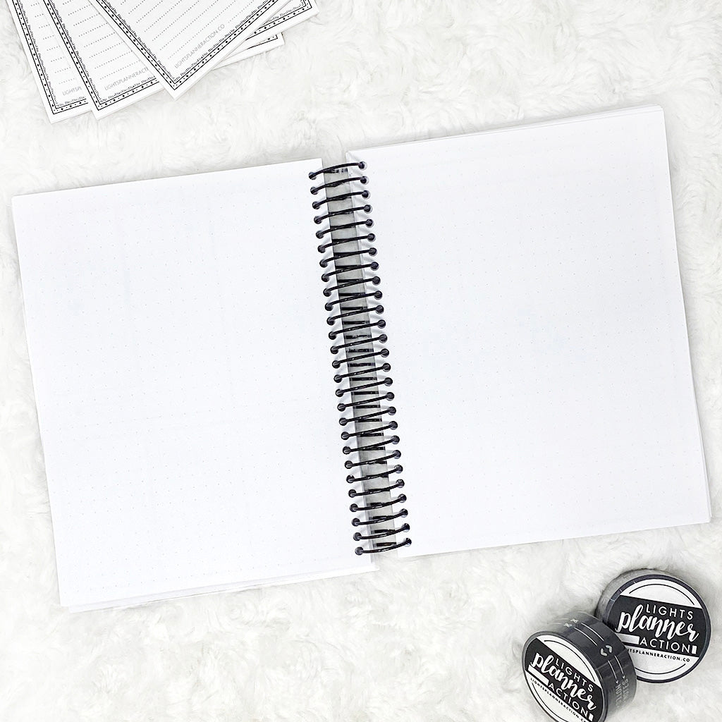 - Each month is laid out as follows: Monthly Spread, Weekly Spread x5, Dot Grid, repeat.