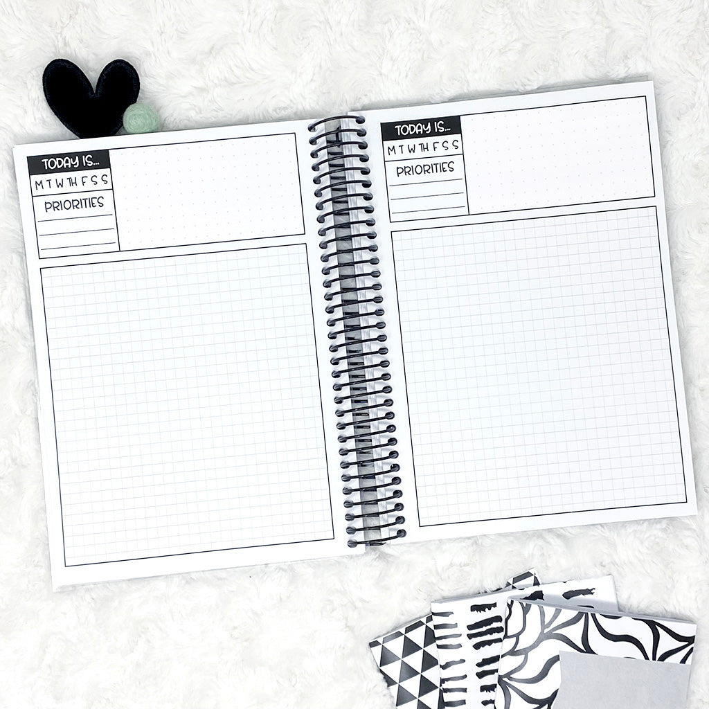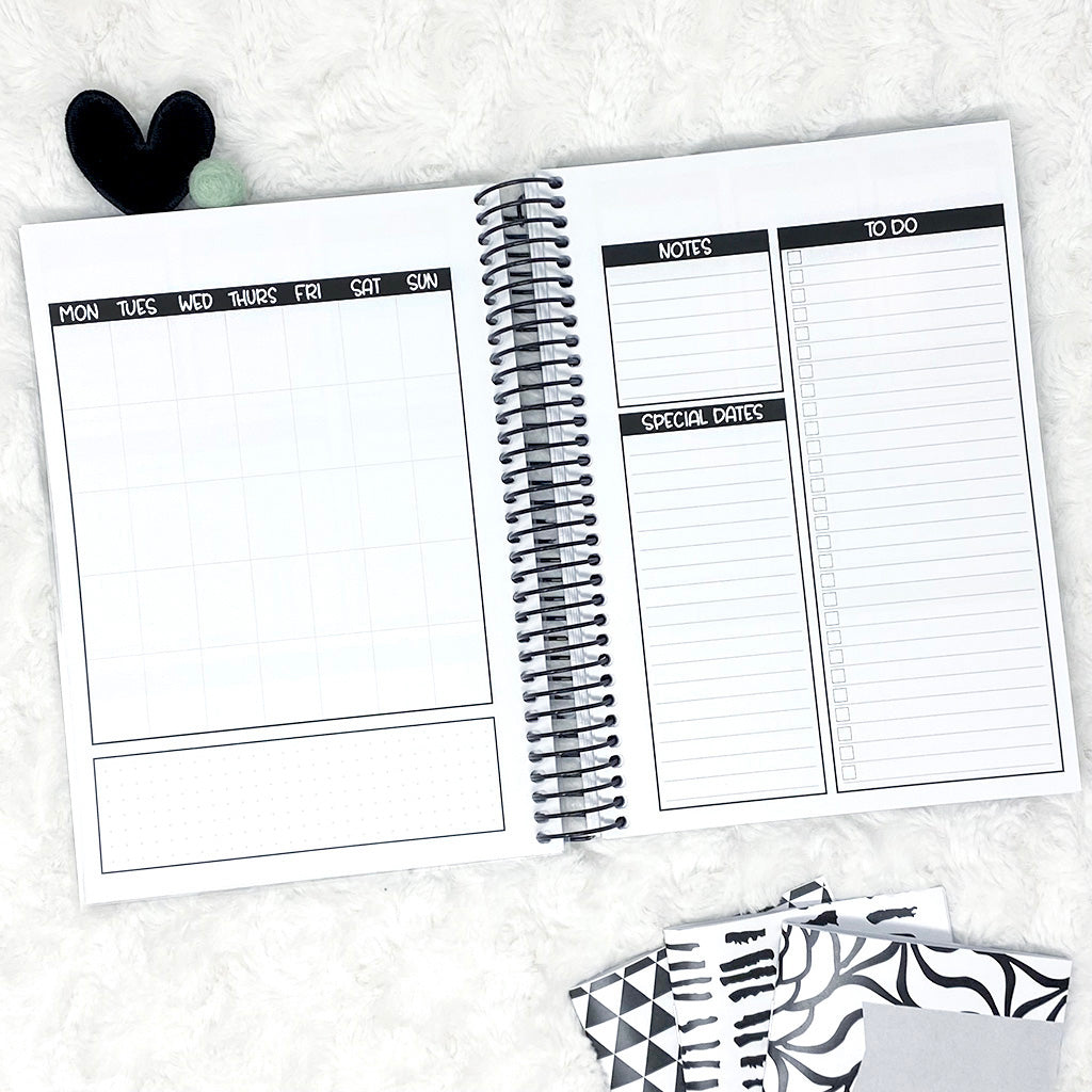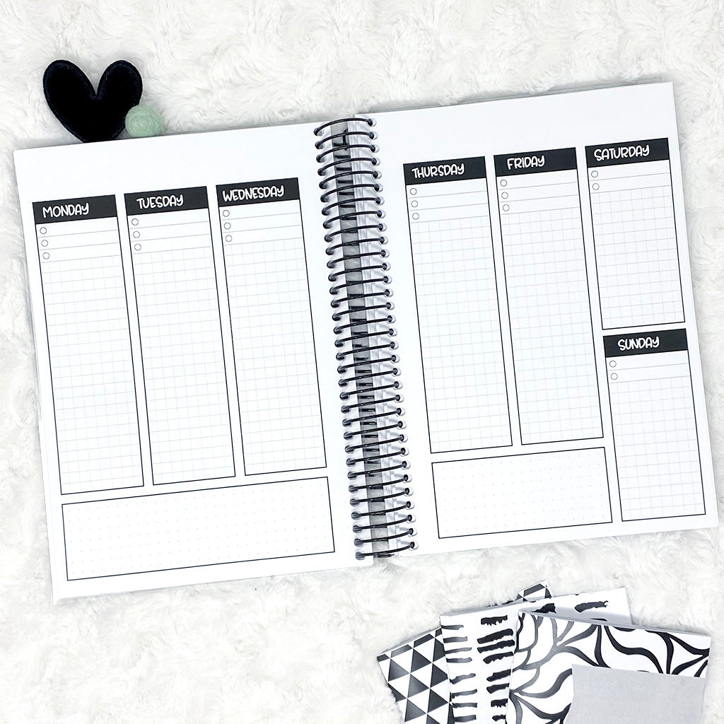 - The planner is laid out as follows: Monthly Spreads, Weekly Spreads, Daily Spreads, and Notes. Months, weeks and days each have their own section.