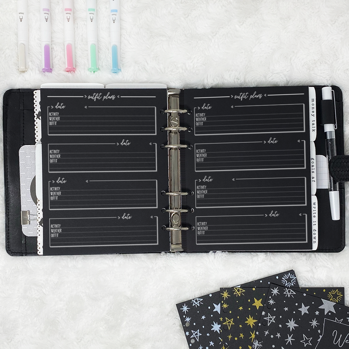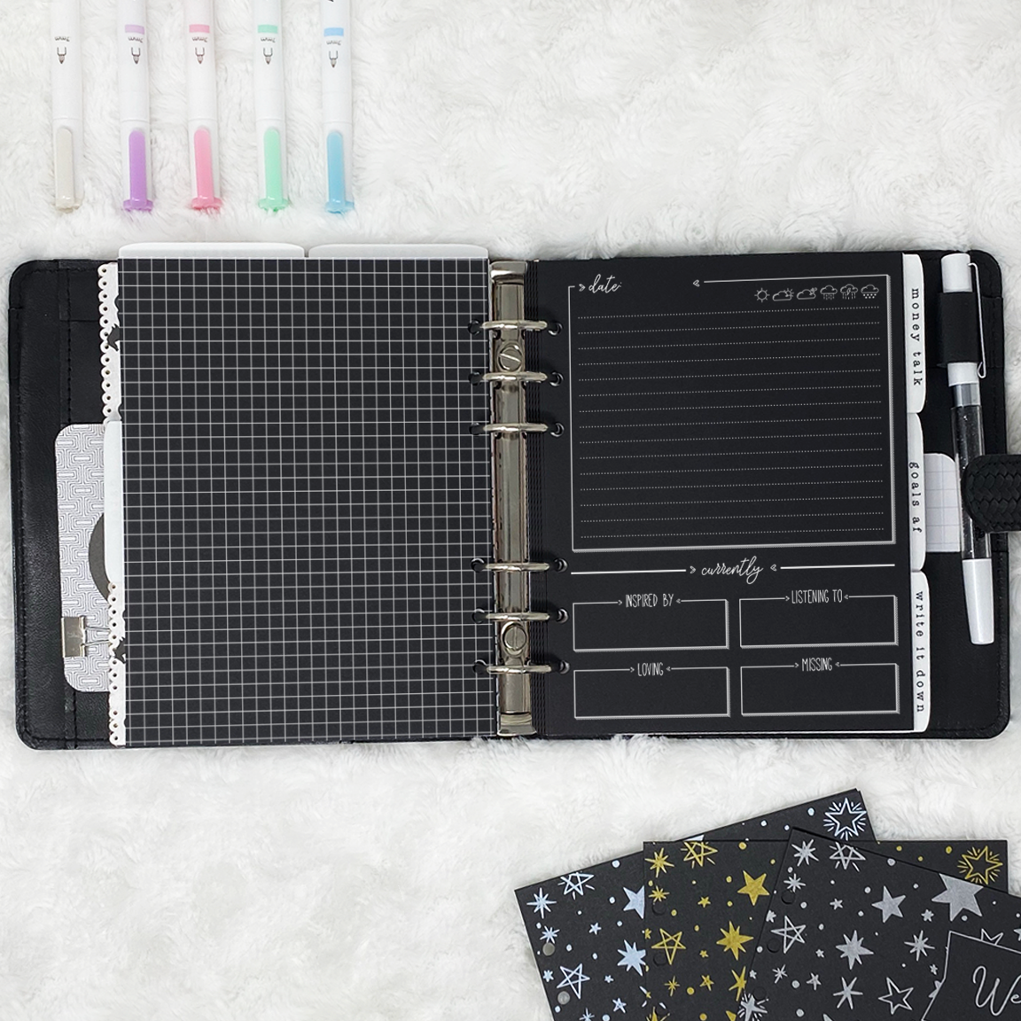 Lights Planner Action laser prints all blackout designs using NEW excellent quality, 90 gsm (roughly 24lb) black paper. Our new blackout paper dries faster and features a nice, smooth surface with a slight drag as you run your pen across it. It makes for a wonderful feel when used with any white or light color inked pen.