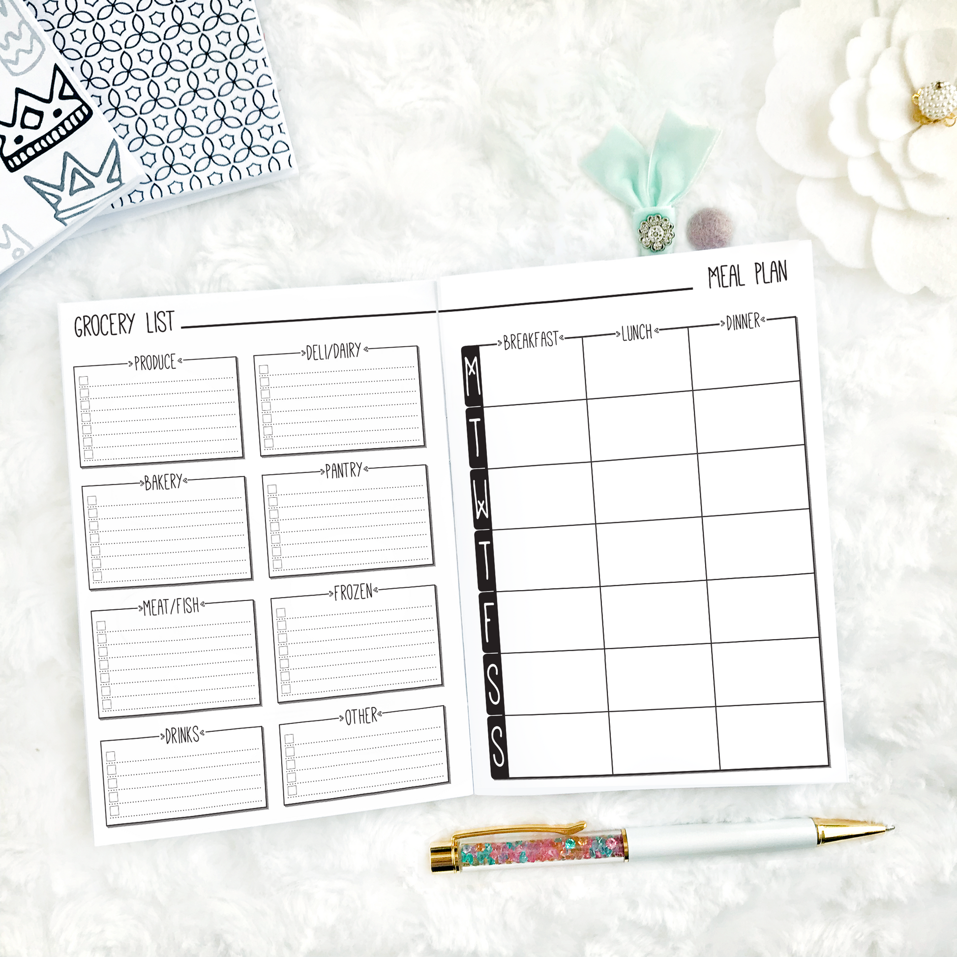 - Each week is laid out as follows: Weekly Overview, Weekly Spread, Meal Planner, repeat