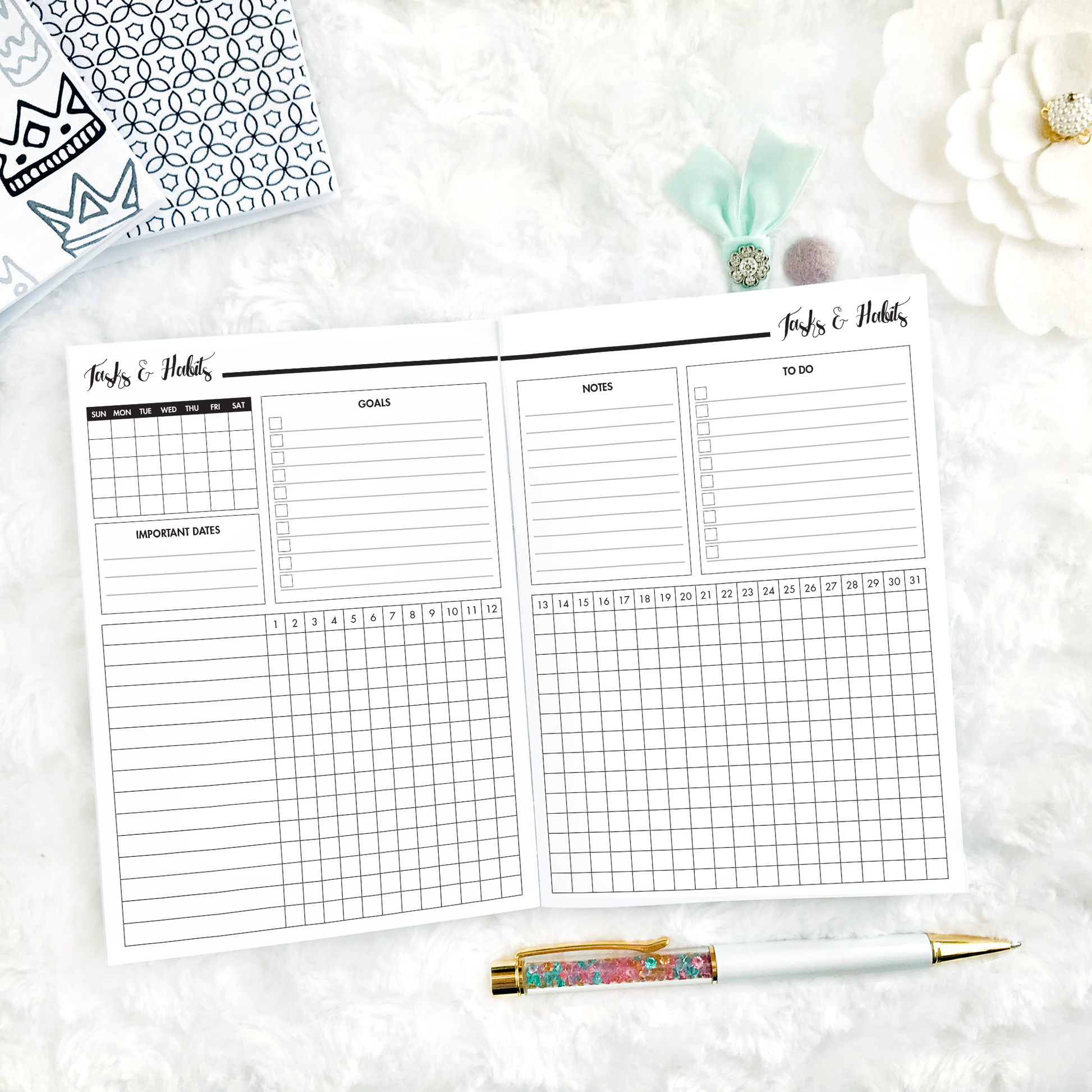 - Tasks & habits tracker (important dates, habit tracker, goals, notes, and to do)